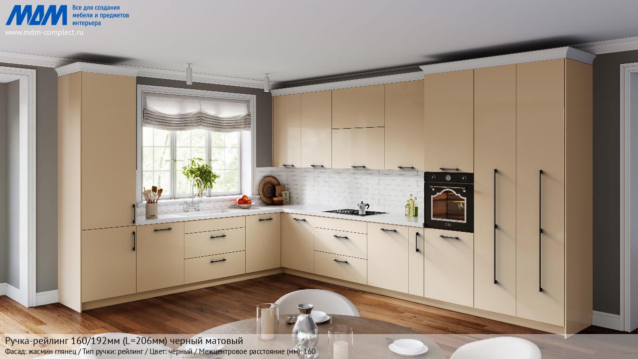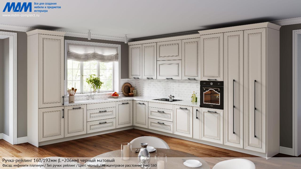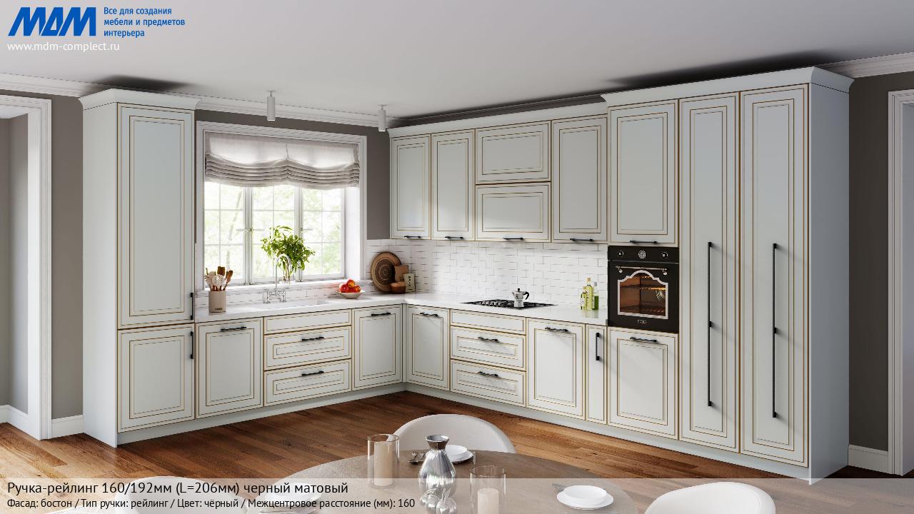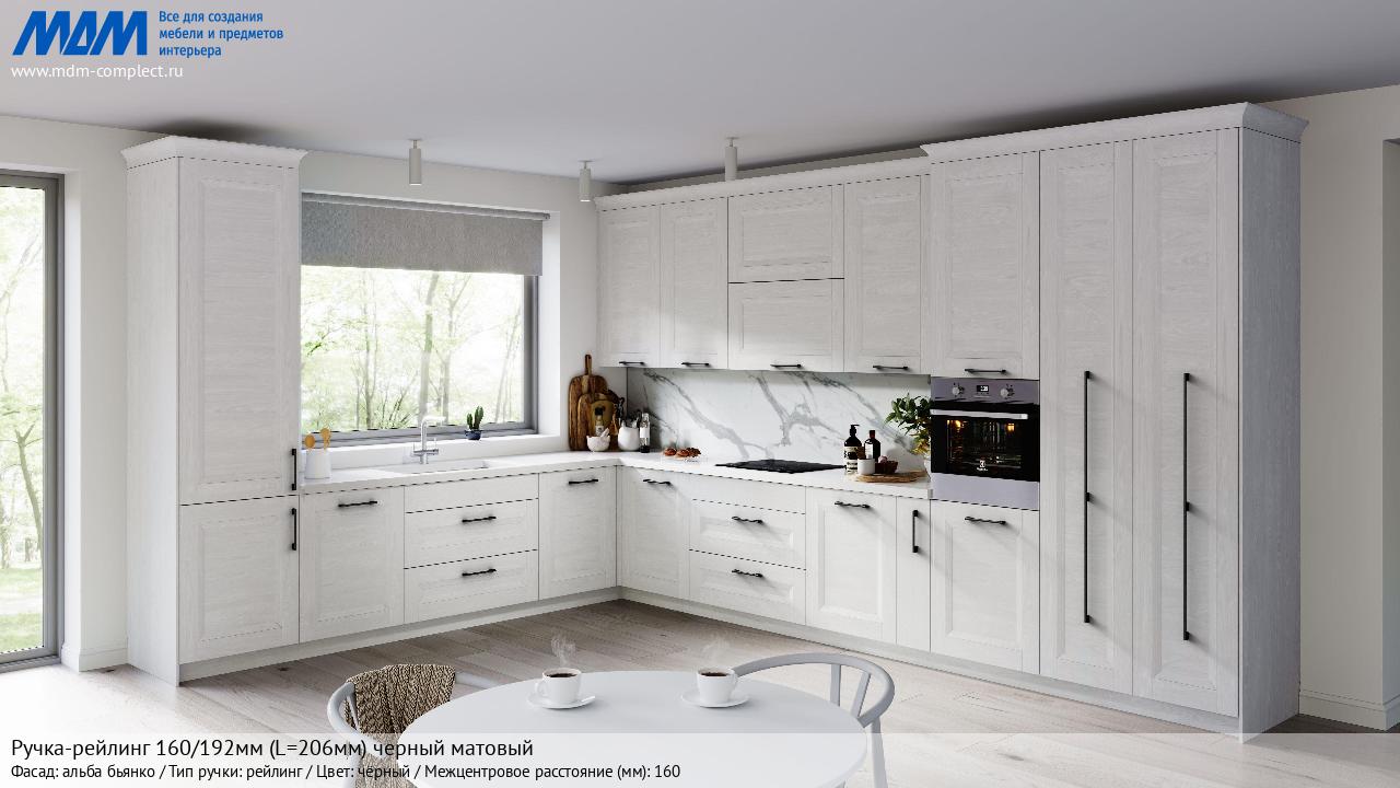 Мебельная Ручка-рейлинг 160/192мм (L=206мм) черный матовый на различных фасадах в кухонном интерьере в стиле классика, лофт, модерн.
