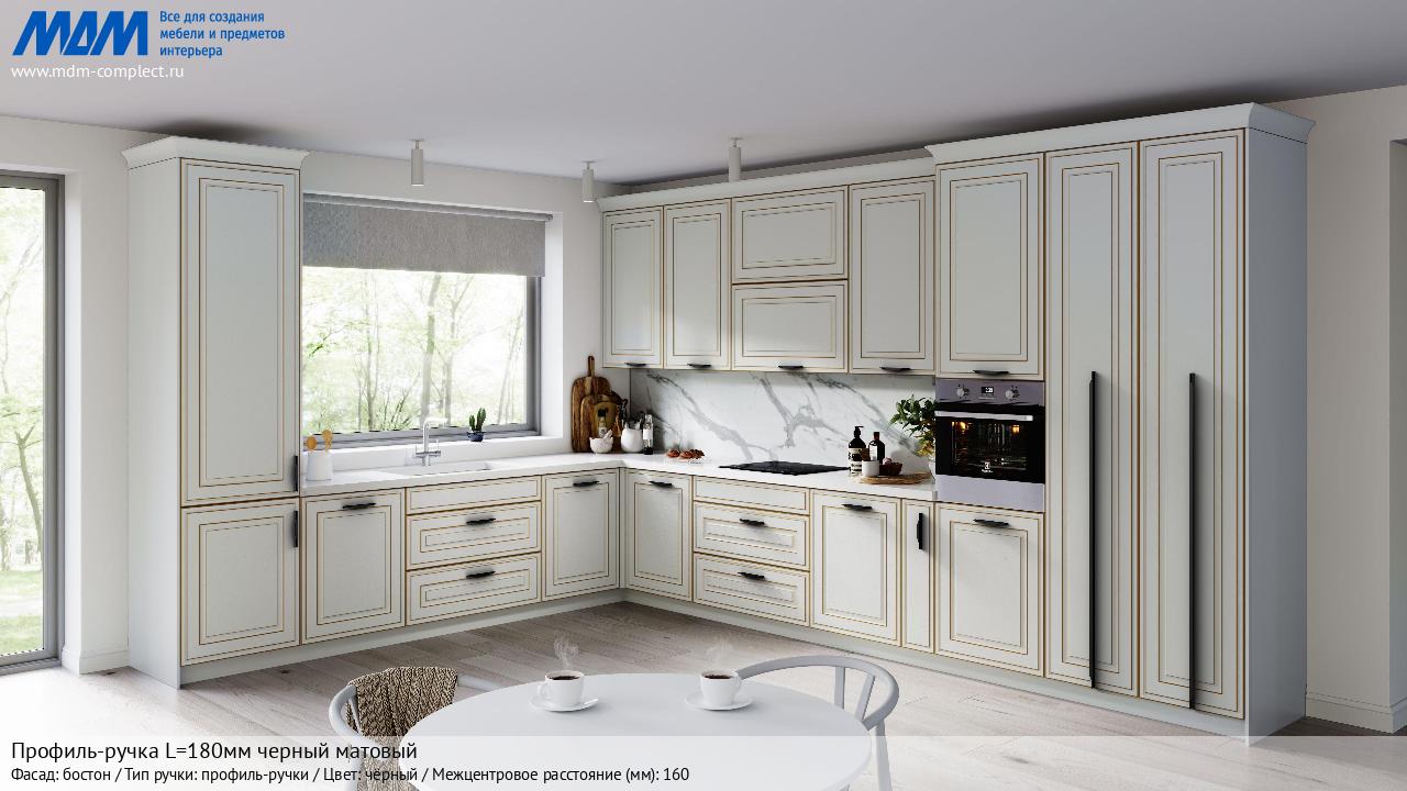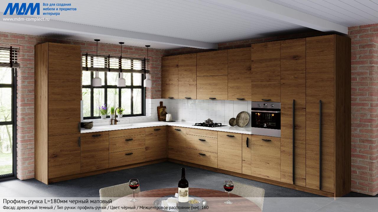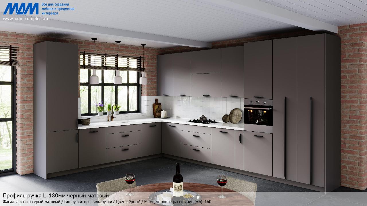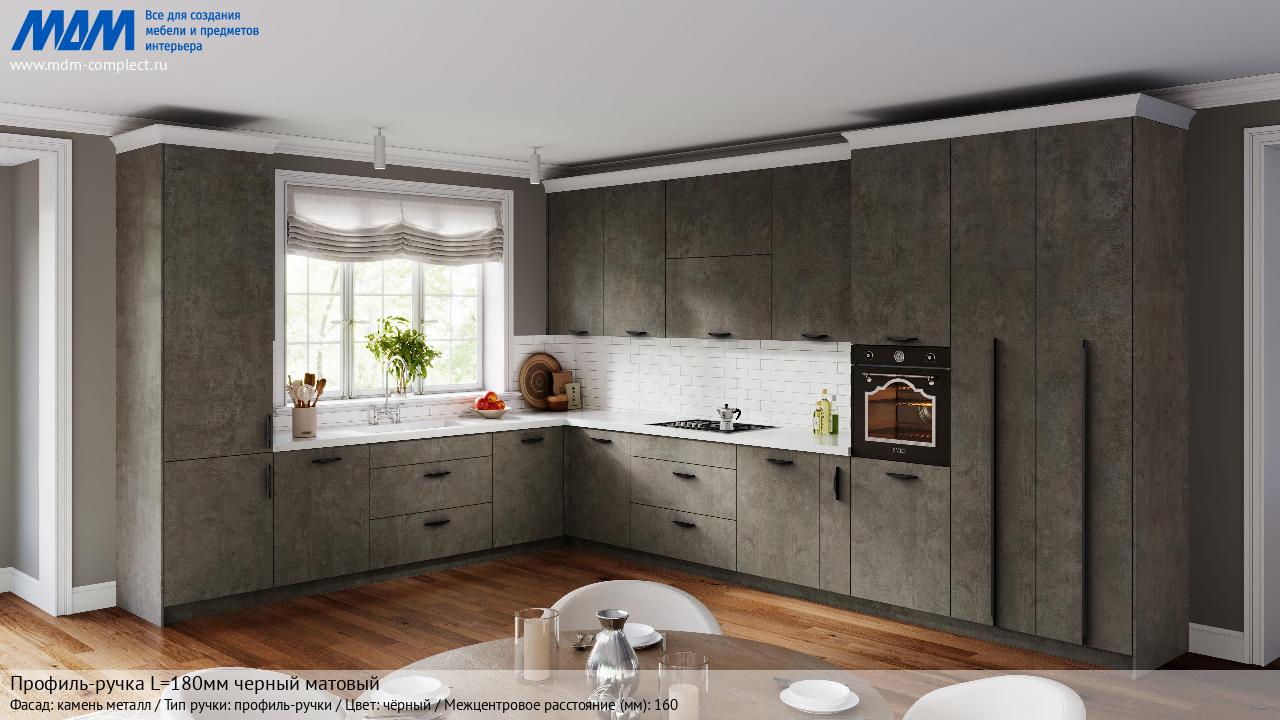 Мебельная Профиль-ручка L=180мм черный матовый на различных фасадах в кухонном интерьере в стиле классика, лофт, модерн.