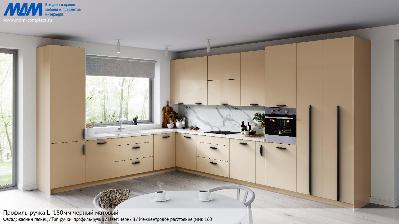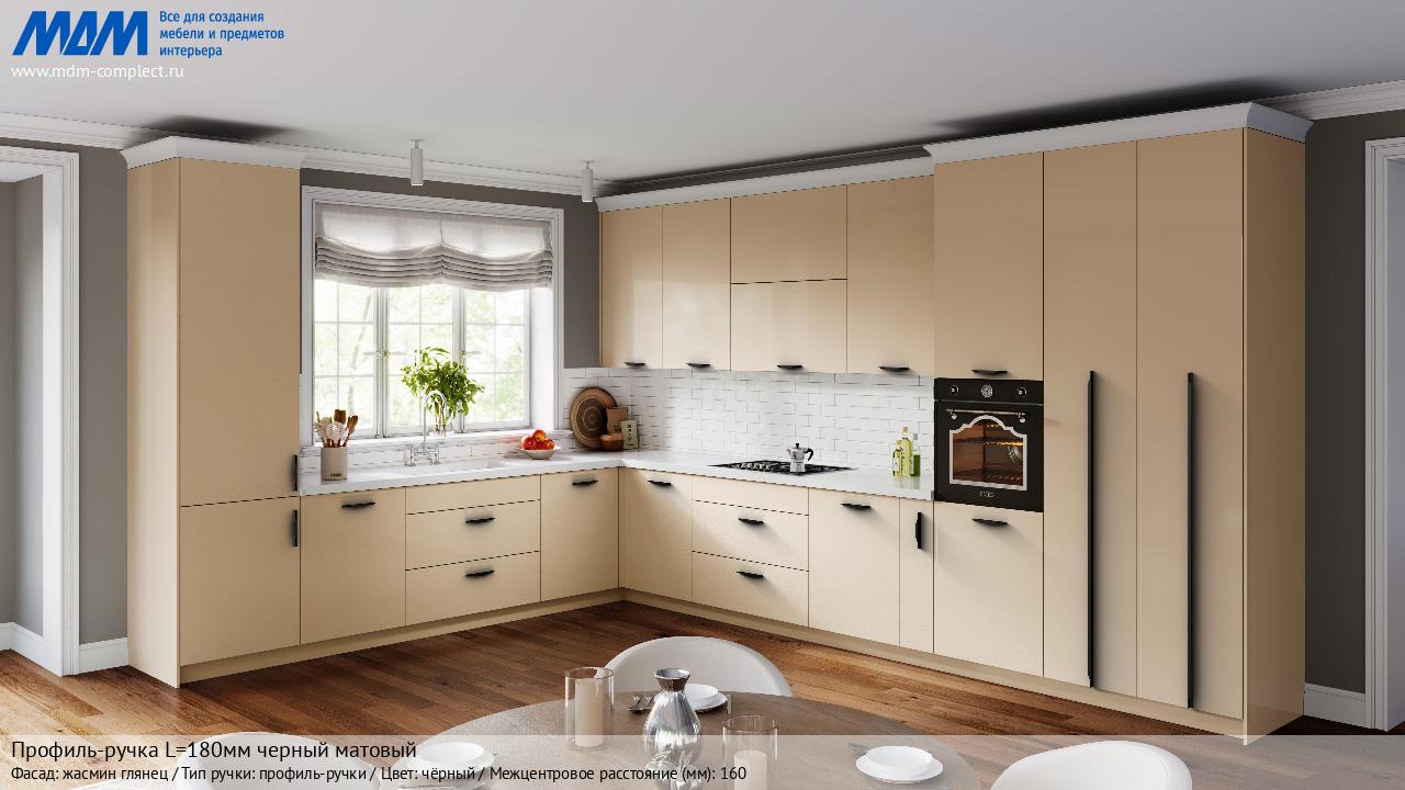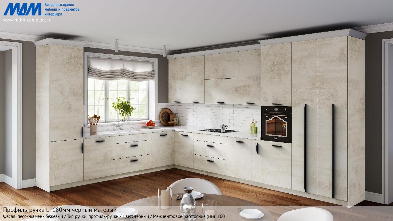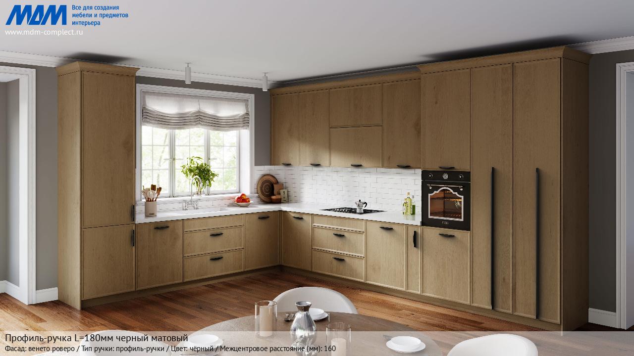 Мебельная Профиль-ручка L=180мм черный матовый на различных фасадах в кухонном интерьере в стиле классика, лофт, модерн.