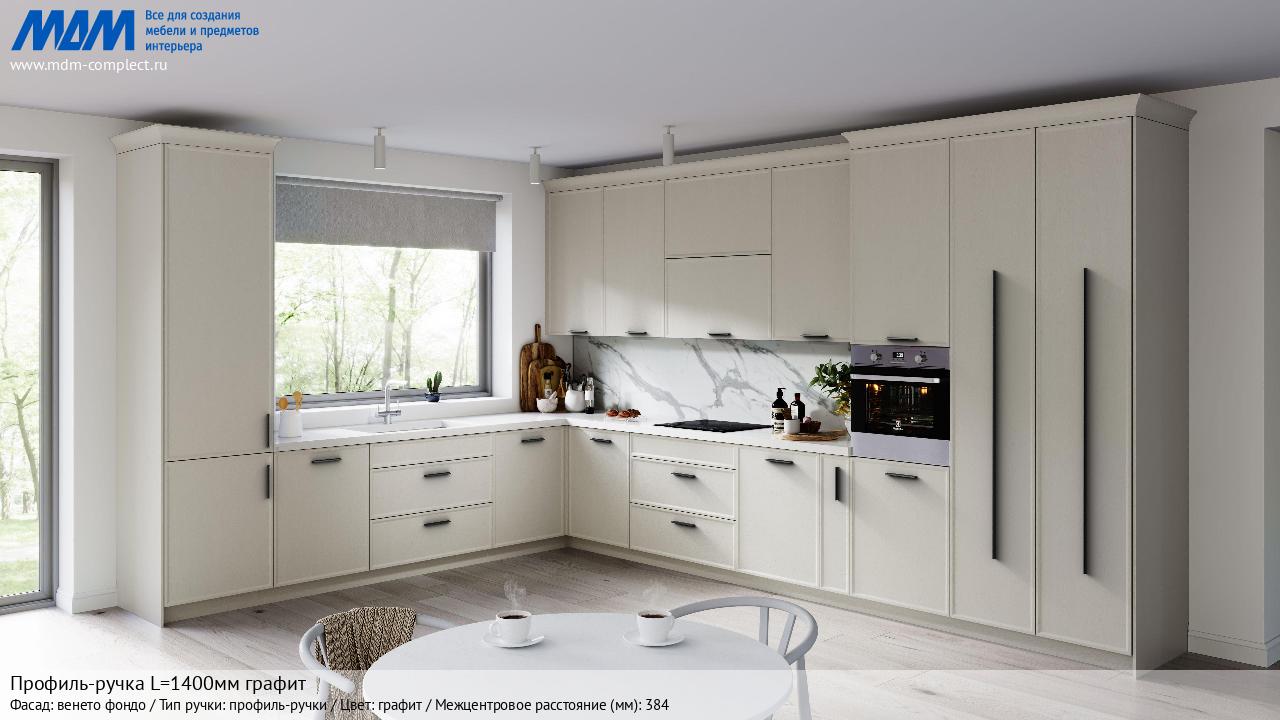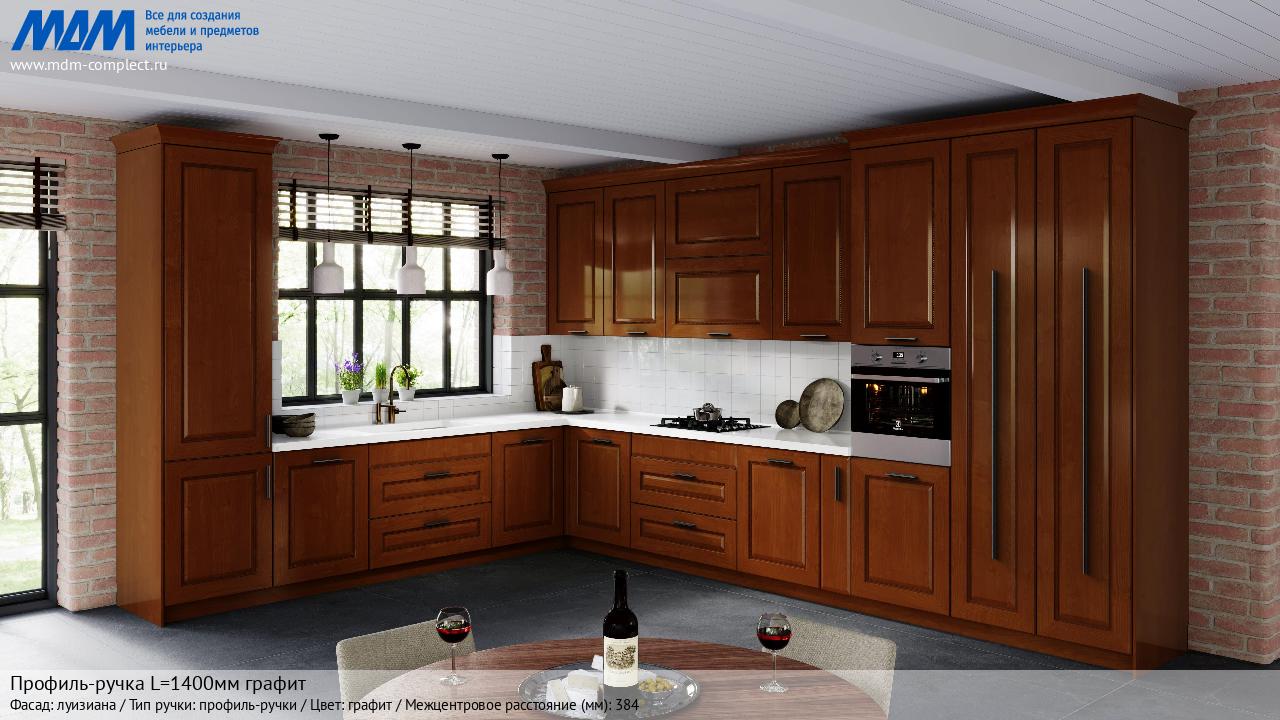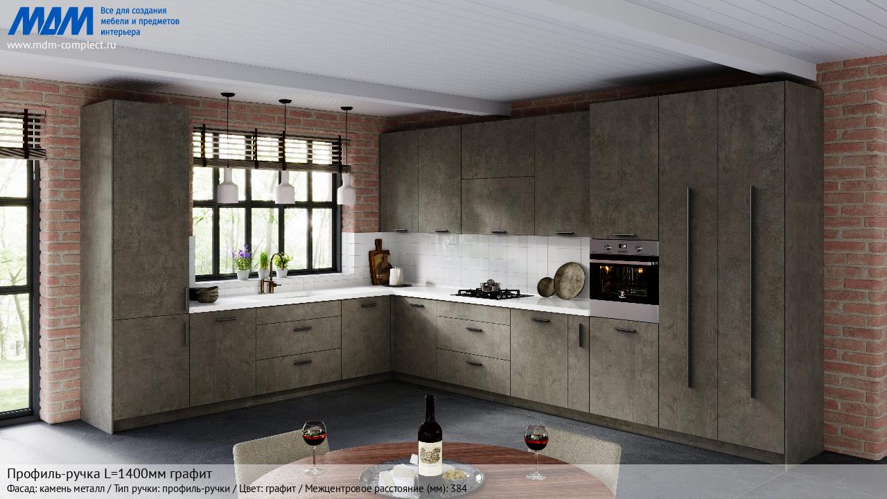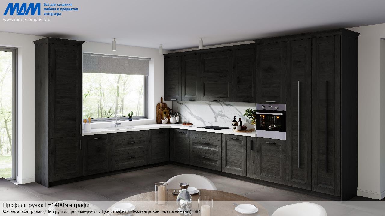 Мебельная Профиль-ручка L=1400мм графит на различных фасадах в кухонном интерьере в стиле классика, лофт, модерн.