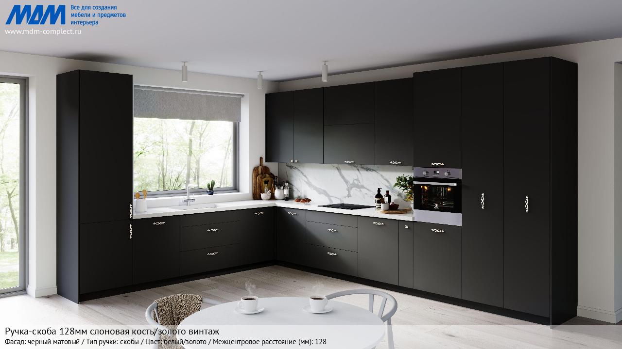 Мебельная Ручка-скоба 128мм cлоновая кость/золото винтаж на различных фасадах в кухонном интерьере в стиле классика, лофт, модерн.