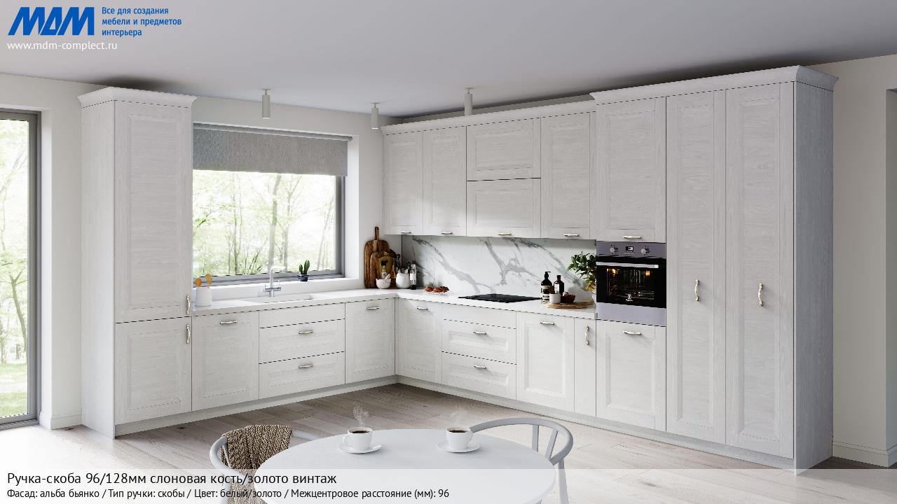 Мебельная Ручка-скоба 96/128мм cлоновая кость/золото винтаж на различных фасадах в кухонном интерьере в стиле классика, лофт, модерн.