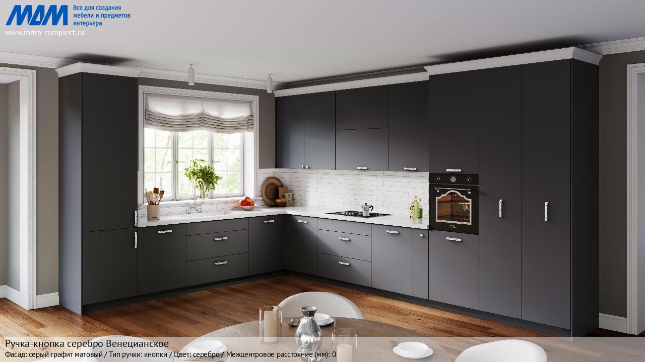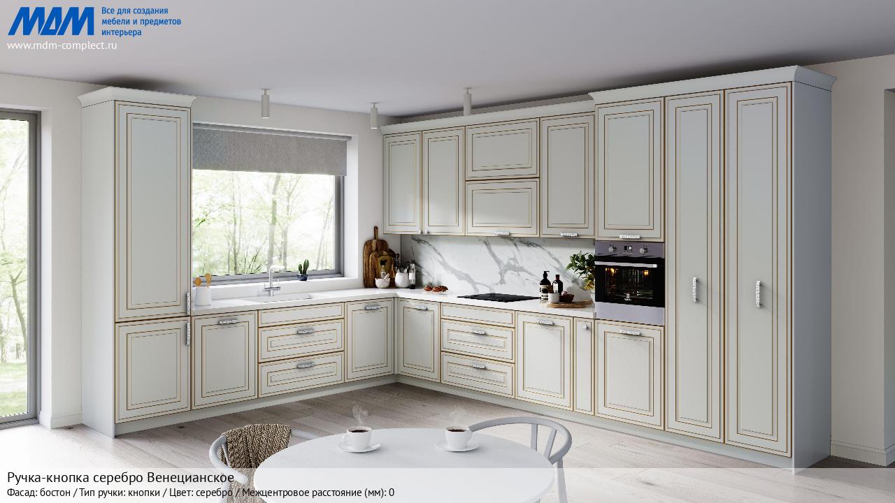 Мебельная Ручка-кнопка серебро Венецианское на различных фасадах в кухонном интерьере в стиле классика, лофт, модерн.