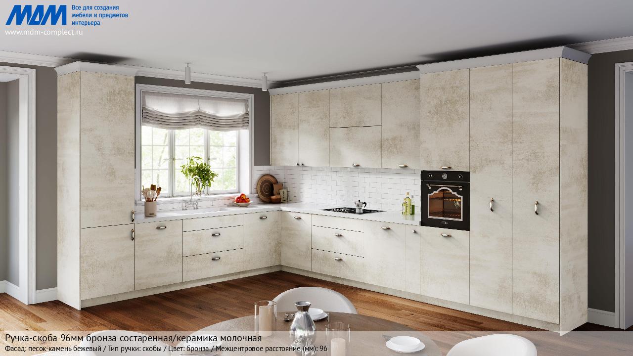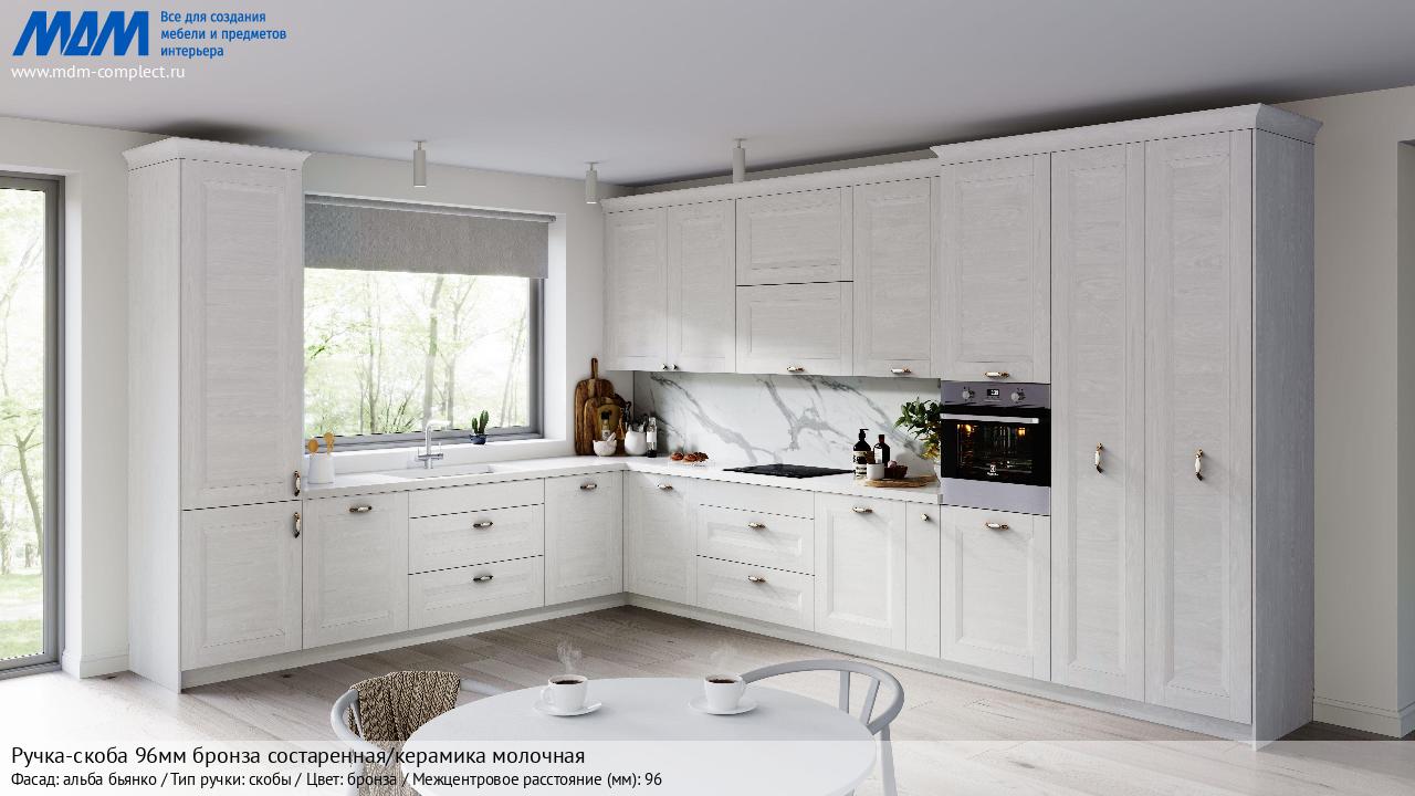 Ручка-скоба 96мм бронза состаренная/керамика молочная (WMN.97.01.00.096.D1) в готовой кухне на различных фасадах