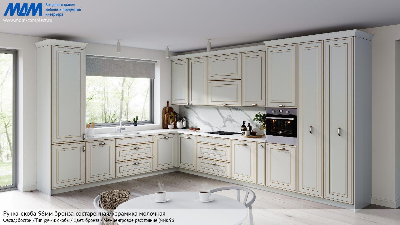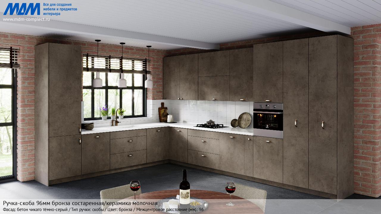 Мебельная Ручка-скоба 96мм бронза состаренная/керамика молочная на различных фасадах в кухонном интерьере в стиле классика, лофт, модерн.