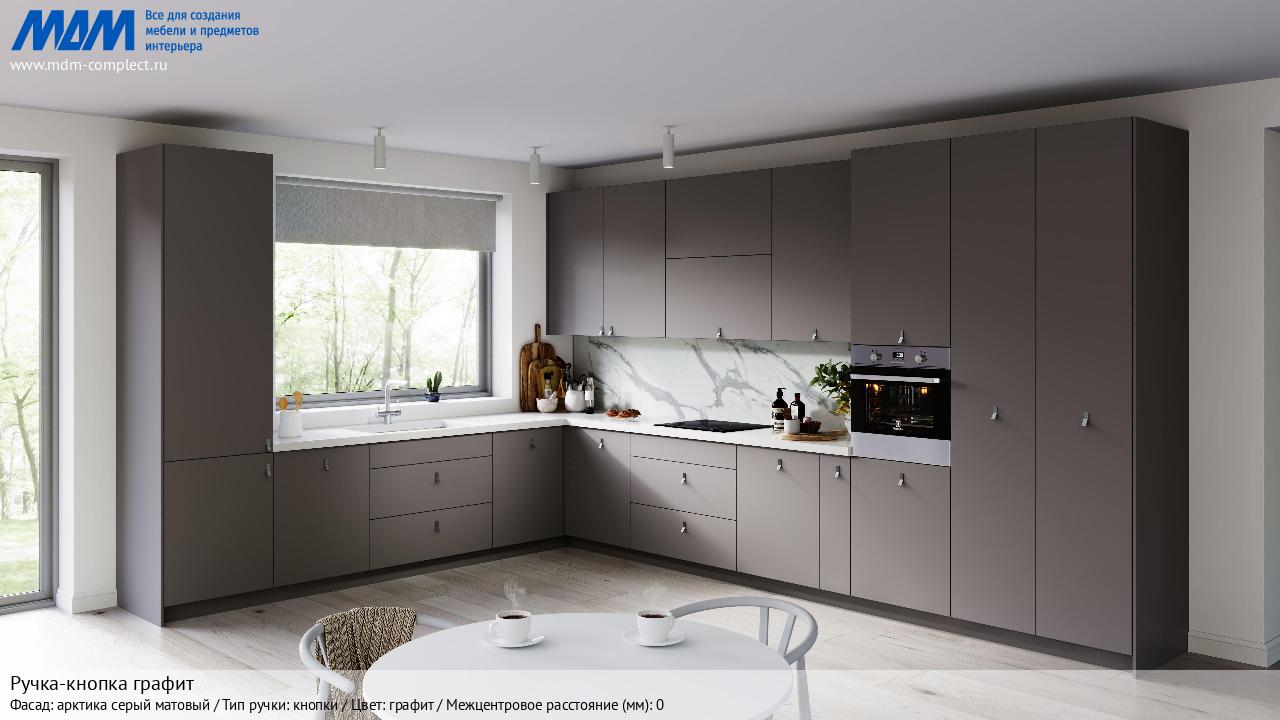 Ручка-кнопка графит (411.75) в готовой кухне на различных фасадах