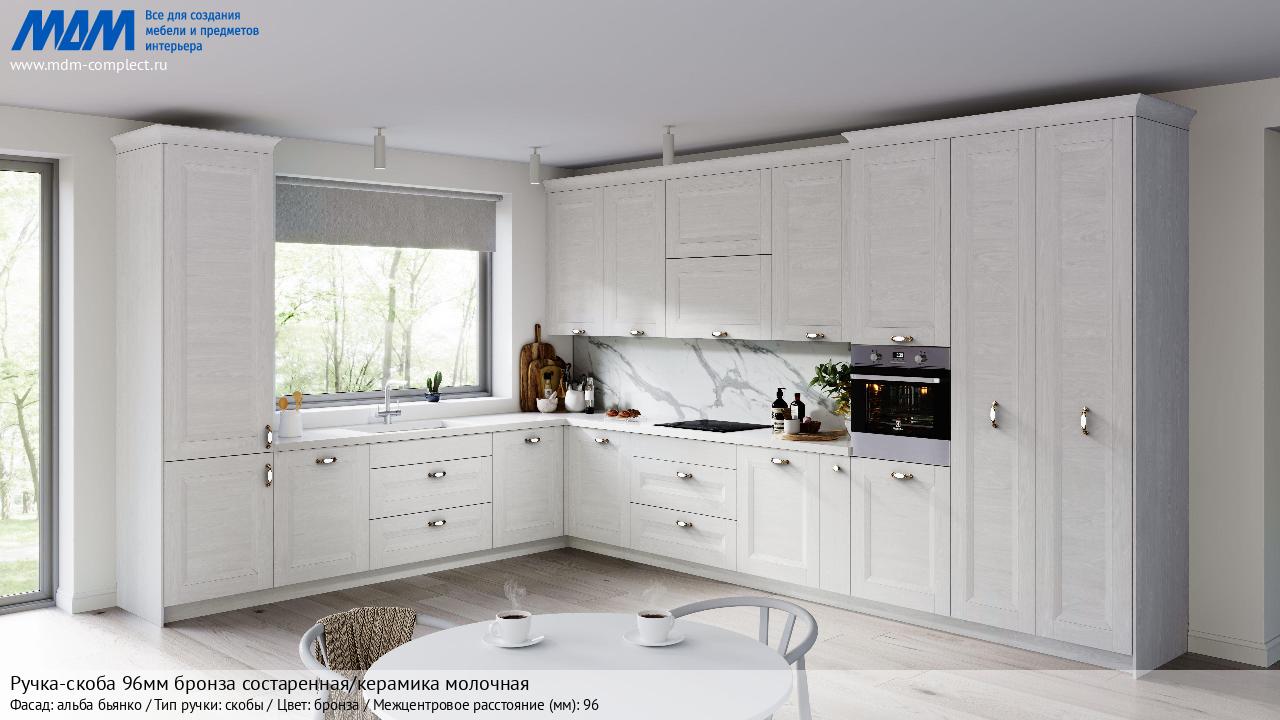 Ручка-скоба 96мм бронза состаренная/керамика молочная (WMN.84.01.00.096.D1) в готовой кухне на различных фасадах