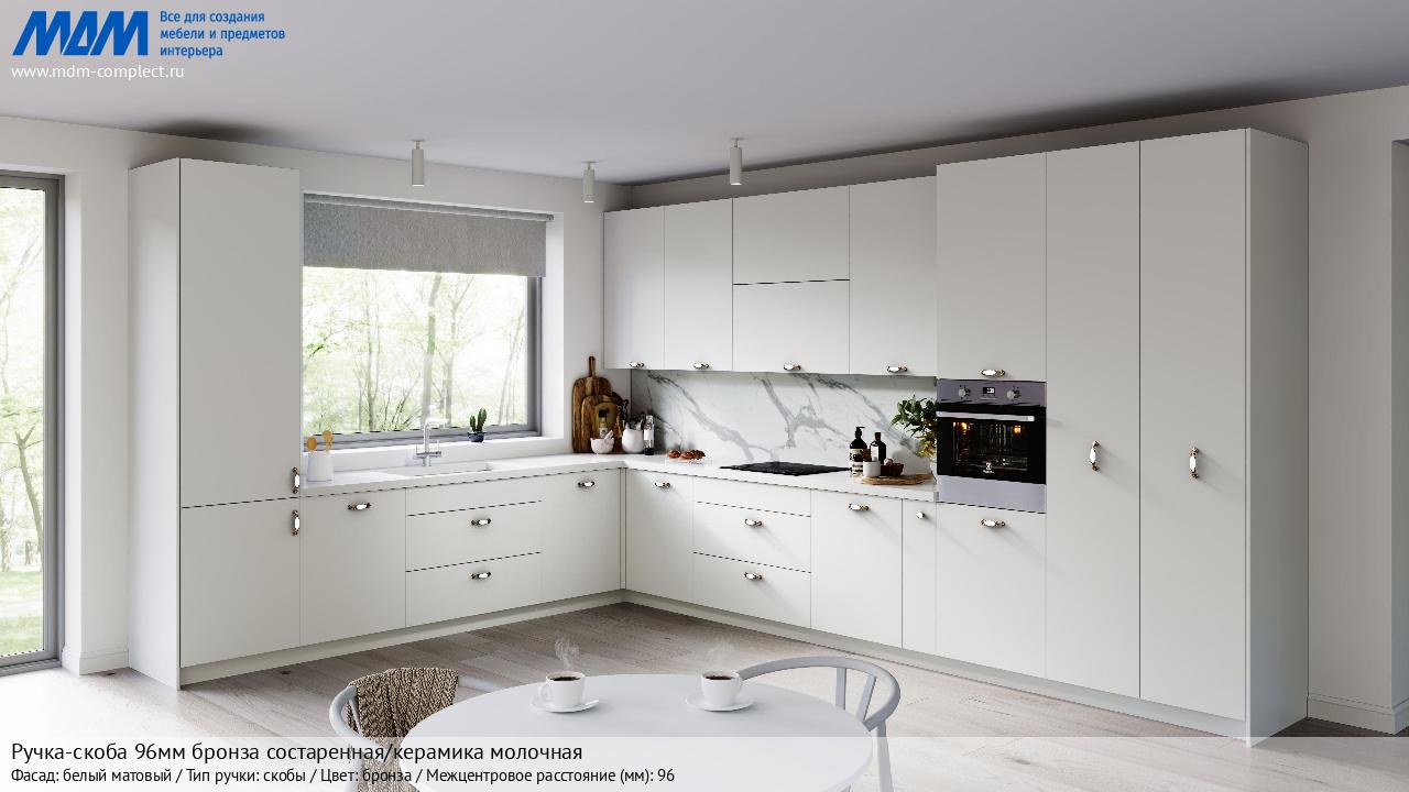Мебельная Ручка-скоба 96мм бронза состаренная/керамика молочная на различных фасадах в кухонном интерьере в стиле классика, лофт, модерн.