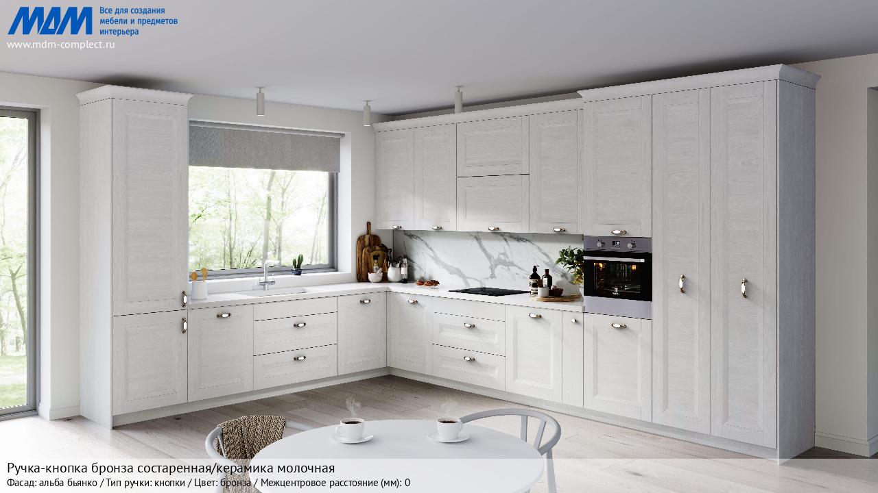Мебельная Ручка-кнопка бронза состаренная/керамика молочная на различных фасадах в кухонном интерьере в стиле классика, лофт, модерн.