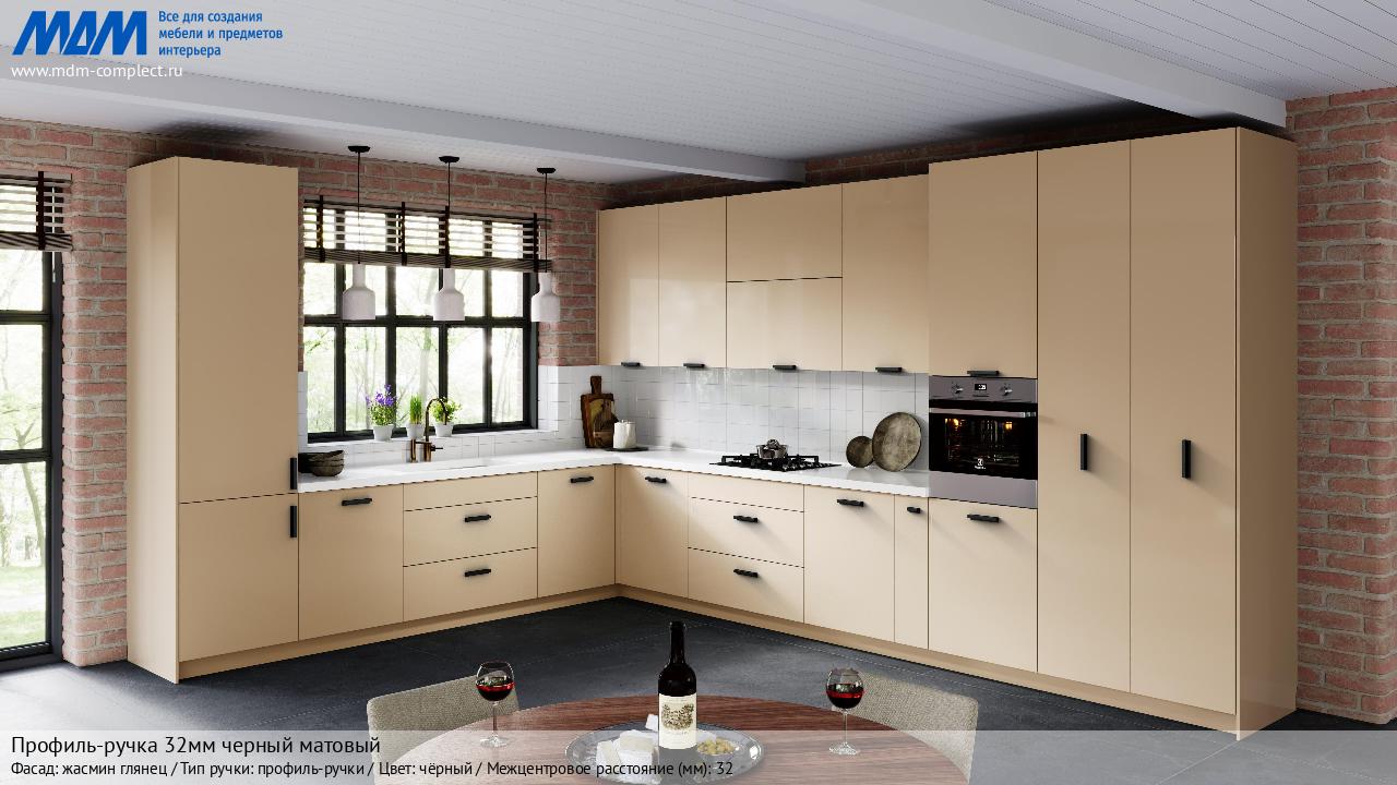 Мебельная Профиль-ручка 32мм черный матовый на различных фасадах в кухонном интерьере в стиле классика, лофт, модерн.