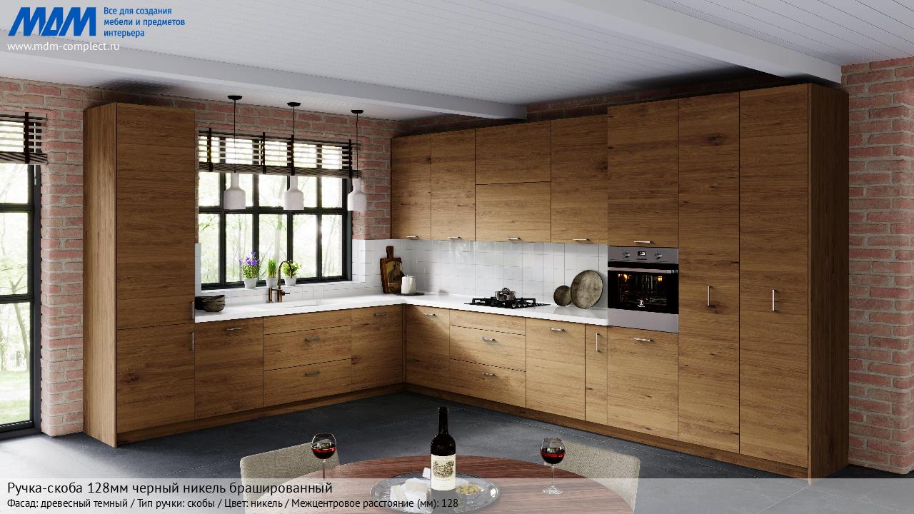 Мебельная Ручка-скоба 128мм черный никель брашированный на различных фасадах в кухонном интерьере в стиле классика, лофт, модерн.
