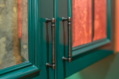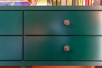 Для всей мебели была использована новая серия ручек-скоб и кнопок в покрытии железо от итальянского производителя Giusti.